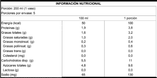 Agua, azúcar, proteína de arveja, fibra de achicoria, cacao en polvo, manteca de coco, jugo concentrado de piña, carbonato de calcio, aceite de maravilla, goma de acacia, goma gelán, saborizantes naturales, sal, fosfato dipotásico, jugo concentrado de repollo, vitamina D y vitamina B12.
