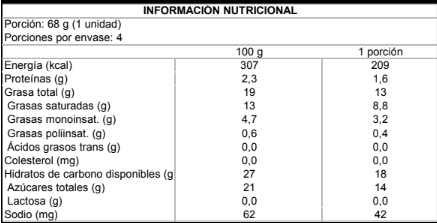 Agua, cobertura de chocolate (28%) (manteca de cacao, azúcar, cacao en polvo, lecitina de girasol), salsa sabor frambuesa (9%) (azúcar, pulpa de frambuesa, agua, colorante natural (antocianinas), goma de semilla de algarrobo, ácido cítrico, saborizante idéntico a natural), azúcar, manteca de coco, jarabe de glucosa, proteína de arveja, fibra de achicoria, goma de acacia, goma guar, goma de semilla de algarrobo, saborizantes naturales, sal.