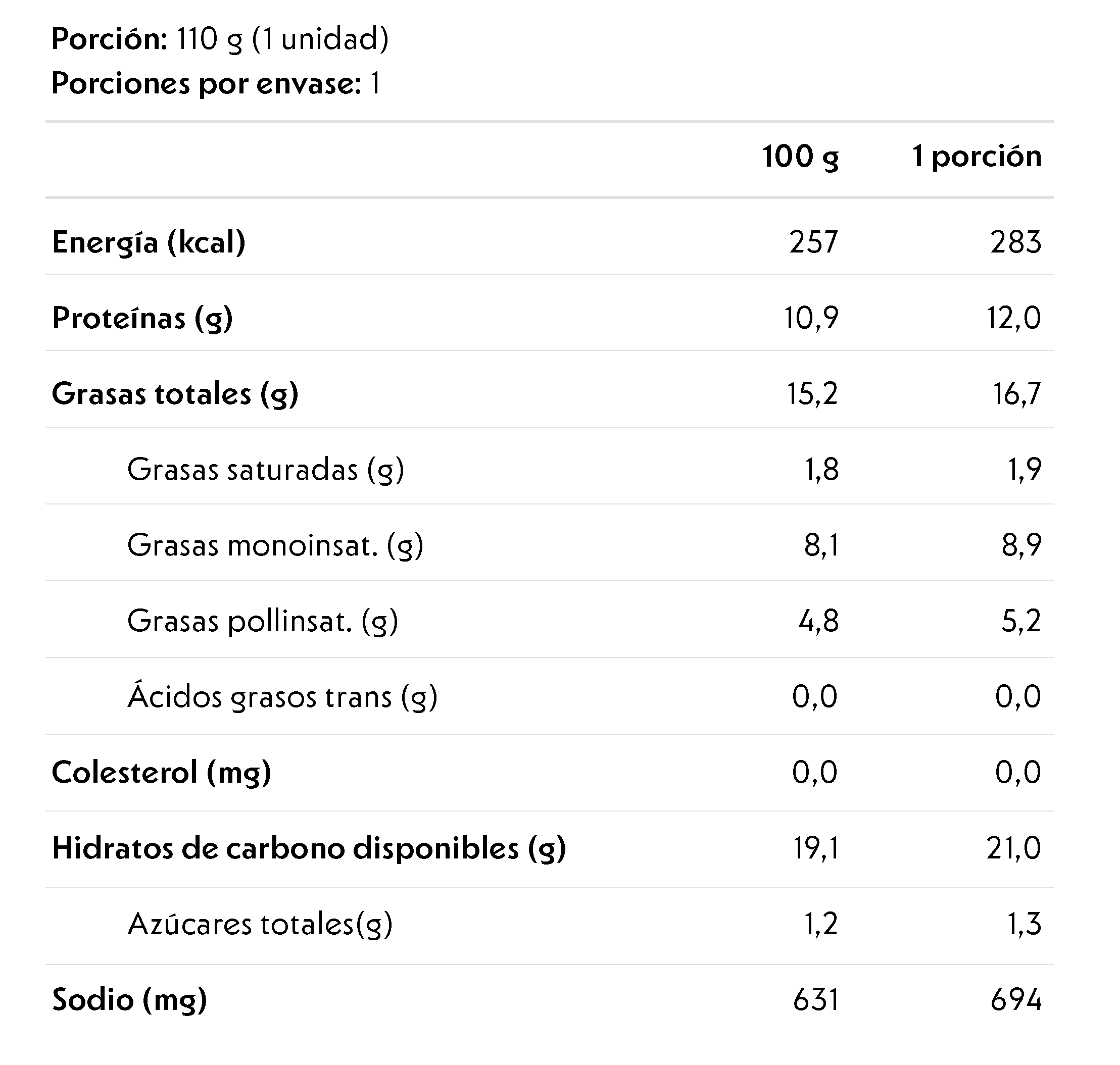 Agua, harina, aceite vegetal (soya, maravilla), proteína de arveja, proteína de haba, gluten de trigo, metilcelulosa, fibra de bambú, saborizantes naturales, sal, almidón de maíz, fibra de trigo, levadura, choclo en polvo, cebolla en polvo, durazno en polvo, ajo en polvo, difosfato disódico, bicarbonato de sodio y cúrcuma.