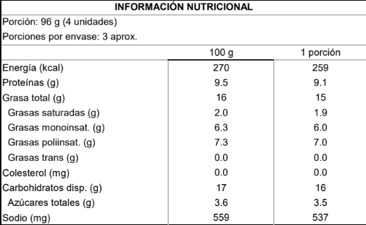 Agua, harina de trigo, aceite vegetal (soya y maravilla), proteína de arveja, metilcelulosa, saborizantes naturales, gluten de trigo, almidón de maíz, fibra de bambú, fibra de trigo, sal, levadura, cebolla en polvo, ajo en polvo, choclo en polvo, pirofosfato de sodio, bicarbonato de sodio, cúrcuma, durazno en polvo.